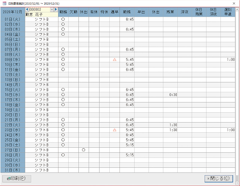 日別・月間・勤怠一覧などの出力可能。残業時間45時間超過などの集計も出力可能。